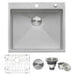 Sink, rinse grid, basket strainer, decorative drain cover, cutout template, and mounting brackets