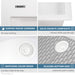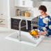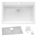 Sink, silicone bottom grid, white strainer drain assembly, cutout template, mounting clips, installation guide