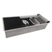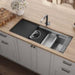Unique to this collection, the Dual-Tier Nova includes heavy-duty black solid composite accessories for a striking contrast against the sink’s stainless steel surface. These include a reversible black composite cutting board, a 3-bowl condiment tray, a black composite platform with mixing bowl and colander, and a patented foldable drying rack. Designed to fit seamlessly into the two-tier ledge system, these accessories allow for greater organization and multi-tasking in the kitchen. With its oversized dimensions and built-in versatility, this sink transforms your kitchen workflow.