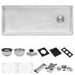 Black composite reversible cutting board/tray, black composite platform with mixing bowl and colander attachments, 3-bowl condiment tray, foldable stainless steel drying rack, bottom rinse grid, basket strainer drain, decorative drain cover, mounting clips, cutout template
