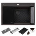 Black composite cutting board, stainless steel foldable drying rack, silicone bottom rinse grid, matching color basket strainer drain assembly, installation guide