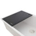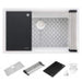 Black composite cutting board, stainless steel foldable drying rack, silicone bottom rinse grid, matching color basket strainer drain assembly, installation guide