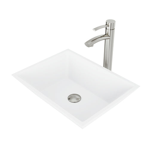 Matte Stone Magnolia Composite Rectangular Vessel Bathroom Sink in White with Sterling Faucet and Pop-Up Drain in Chrome