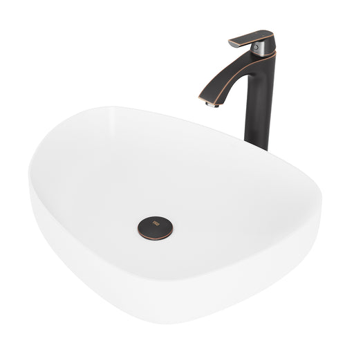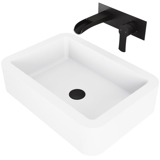 Matte Stone Magnolia Composite Rectangular Vessel Bathroom Sink in White with Faucet and Pop-Up Drain in Matte Black