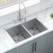 Crafted from premium 16-gauge T-304 stainless steel, this double bowl sink combines durability and ease of cleaning, making it ideal for busy kitchens. The commercial-grade brushed finish resists scratches and complements other appliances. Featuring sharp inside corners for a sleek, modern look, this sink includes a soundproof coating to minimize noise and condensation. Rear drain placement and elegant drain grooves improve functionality, while the stainless steel protective bottom grids shield the sink from scratches and ensure water flows freely.